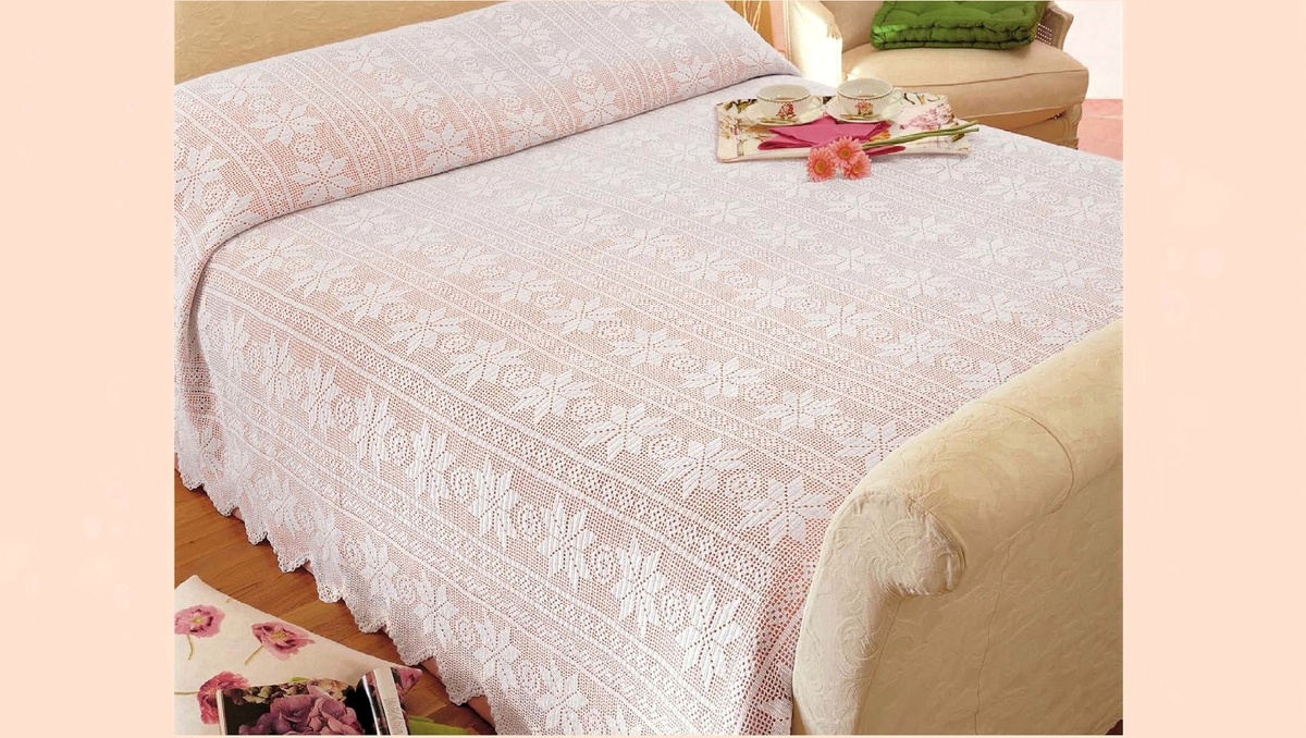 Мотивы могут быть связаны как классическим способом, так и в технике филейного вязания. Такие элементы тоже можно использовать для вязания покрывала на кровать, как в следующем варианте. В целом рисунок позволяет связать из этого мотива и скатерть. К тому же, помимо самого мотива дана кайма, которая прекрасно украшает изделие.