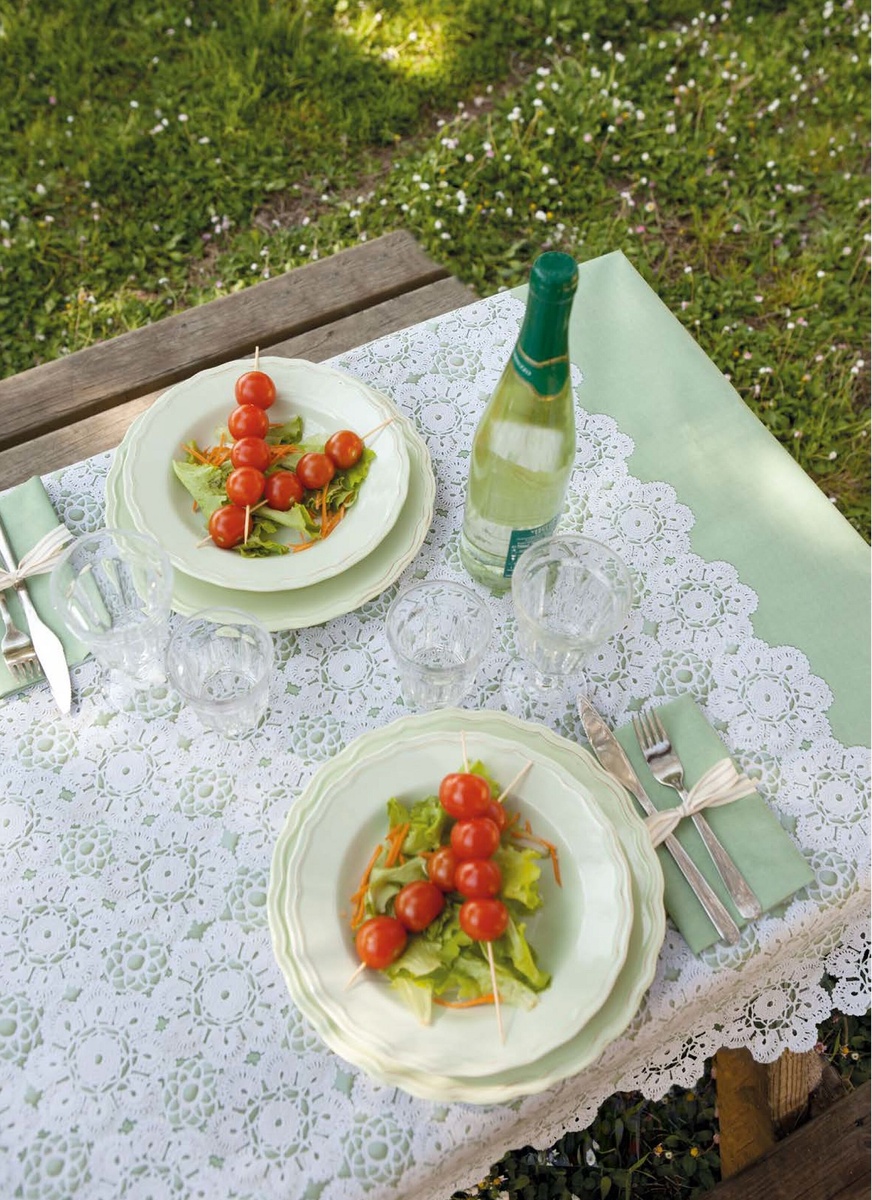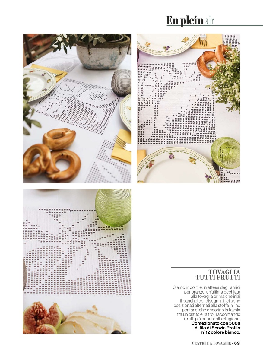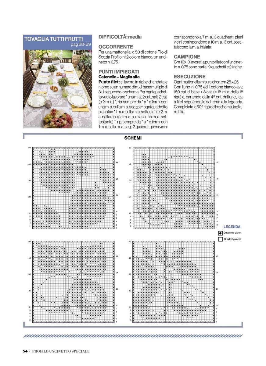 На фото выше мы видим скатерть, в которой чередуются мотивы, связанные в филейной технике. На каждом вязаном элементе изображена ягода или фрукт: клубника, лимон, возможно, слива и груша. Вязаные мотивы чередуются с элементами из однотонной ткани, которые также можно заменить вязаными, например, простой сеткой или столбиками с накидом без какого-либо рисунка.