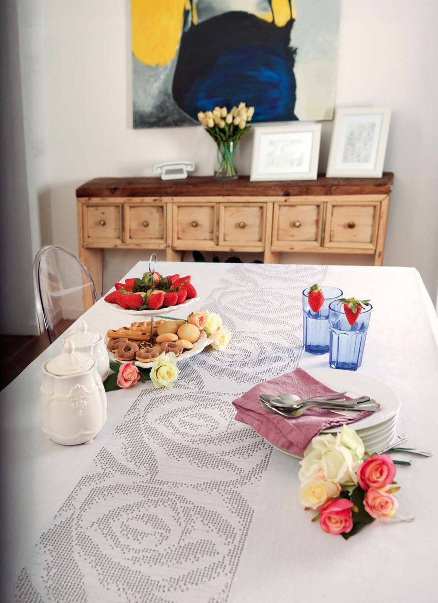 Поскольку салфетка вяжется в филейной технике и использует несколько узоров, можно в качестве мотива отдельно рассмотреть не всю салфетку, а её центральную внутреннюю часть. Также есть мотив, связанный в филейной технике, с рисунком распустившейся розы. На фото ниже видно, что этот мотив используется как часть скатерти: связано несколько одинаковых элементов, соединённых в длинную полосу, а с двух сторон идёт однотонная ткань. Получается скатерть. Но можно связать её полностью только из мотивов с розой или использовать этот элемент для декоративного оформления наволочки на подушку.