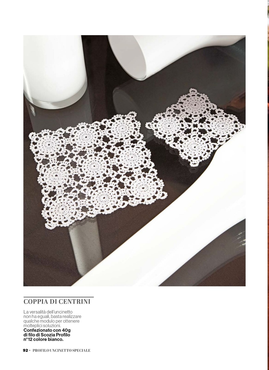 Здесь представлены салфетки из мотивов разной формы: одна квадратная с меньшим количеством элементов, другая прямоугольная с большим. Также есть центральный круглый мотив и соединение между четырьмя мотивами. Серединка у этого большого, основного мотива довольно интересная, и её можно попробовать применить к предыдущему варианту.