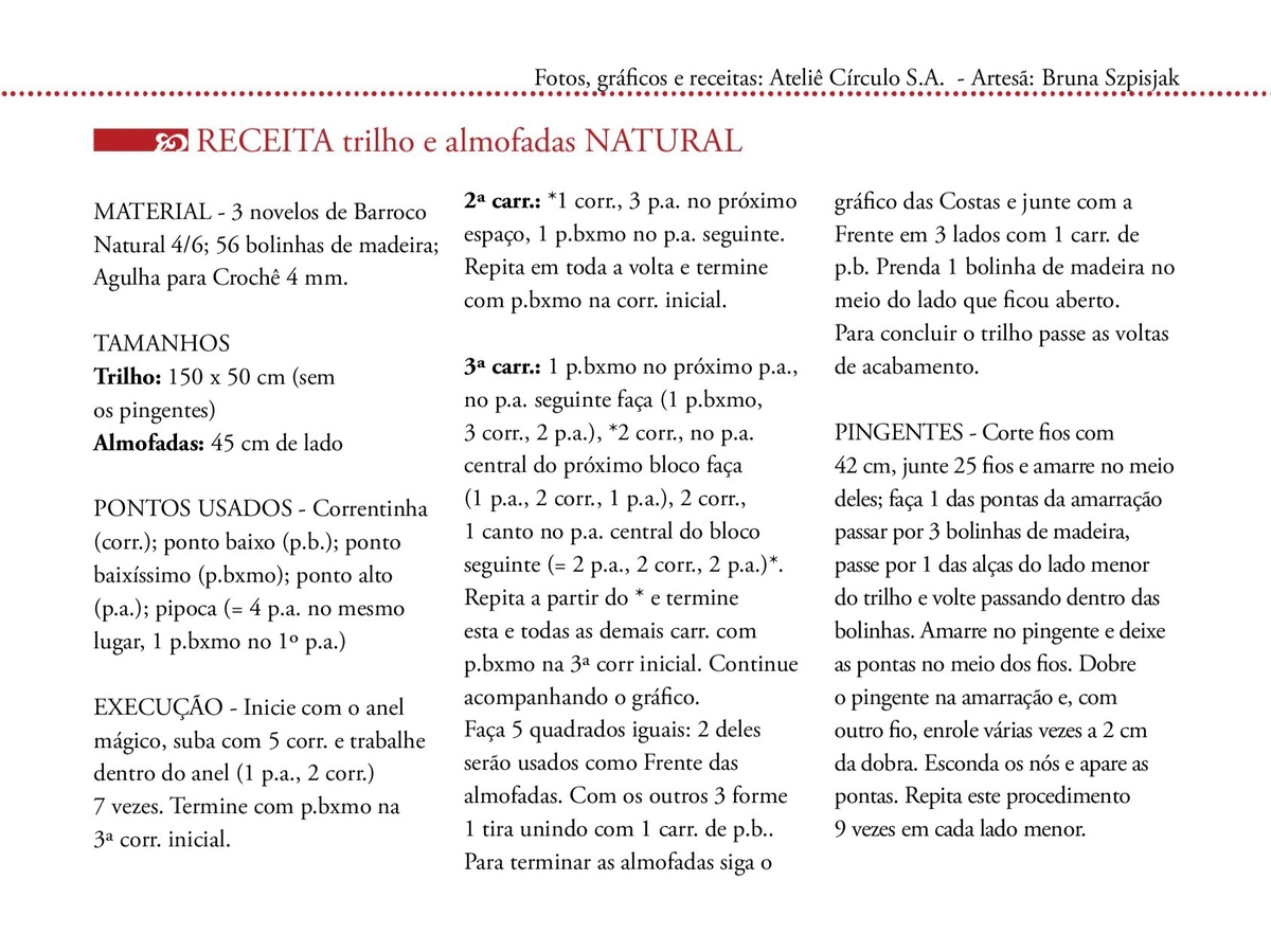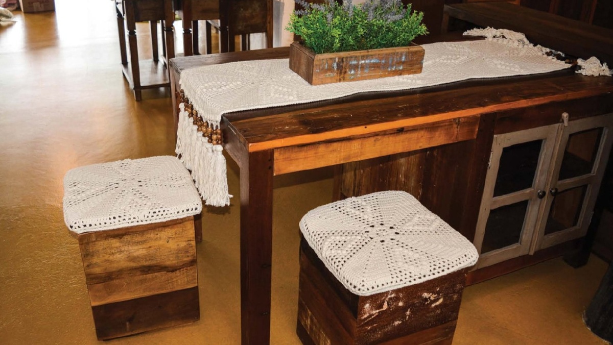 Мотивы, как известно, бывают разного размера, что позволяет вязать разные изделия, о которых мы порой даже не догадываемся, что они выполнены из мотива. Например, первый вариант представляет собой широкий элемент. Из трёх таких мотивов, соединённых между собой, получилась дорожка, украшенная красивыми кисточками. А одного такого мотива оказалось достаточно, чтобы связать чехол для табурета. Так один и тот же мотив используется и на табурете, и в дорожке на столе, выполняя при этом разные функции.