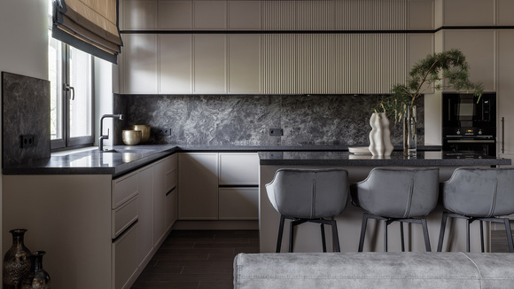 В цвете царит сложная простота. Даже в тёмных кухнях используются не кричащие, а припылённые, глубокие, гармоничные оттенки: благородные серые, тёмно-зелёные, приглушённо-синие. Основная палитра строится на мягких, нейтральных тонах: кремовые, пудровые, тёплые бежевые, натуральные цвета дерева. Яркость и индивидуальность теперь легко привносятся с помощью сменяемых элементов: стулья с выразительным дизайном, текстиль (шторы, полотенца, коврики), посуда на открытых полках, декоративные вазы и искусство — картины, постеры, объекты. Их можно менять по настроению, не меняя дорогостоящую кухонную конструкцию.