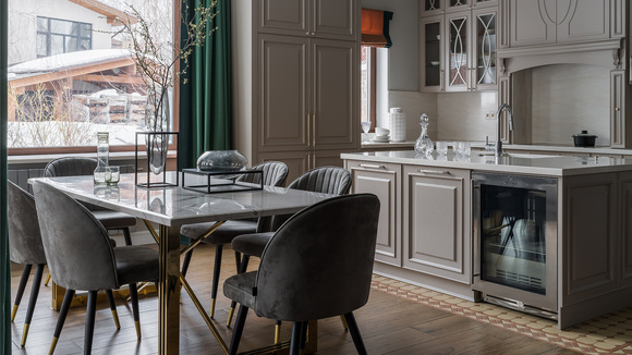 В визуальном дизайне безоговорочно лидирует тренд на облегчённые, воздушные решения. Верхние навесные шкафы уступают место открытым полкам, декоративным порталам из натурального камня или мрамора, нишам для картин и декоративных предметов. Это история про эстетику и разумный минимализм. На открытых полках хранят не всё подряд, а красивые предметы: дизайнерскую посуду, несколько изящных банок со специями, салонные наборы для сервировки, которые сами по себе являются арт-объектами. Это создаёт ощущение простора и делает кухню менее «техногенной».